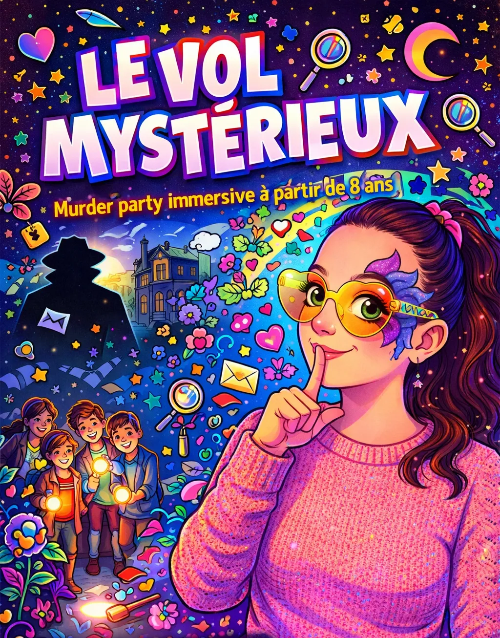 Cette Murder Party a été imaginé pour être accessible dès 8 ans, afin que les enfants puissent vivre leur première enquête immersive aux côtés des adultes ou ensemble.